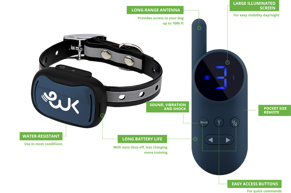 Control the intensity of the shock, sound, or vibration from up to 1,000 feet using the sleek and modern remote, which features a large illuminated screen for ease of reading and accessible buttons.